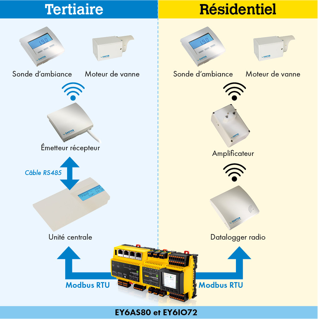 HeatEco Control est une solution de régulation destinée aux installations de chauffage sur boucle d’eau chaude, notamment en rénovation. Le système associe des servomoteurs radio sur vannes de radiateurs, des boîtiers d’ambiance par pièce et un automate modulo6 en chaufferie.