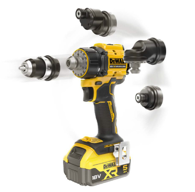 La DCD803 enrichit la gamme XR 18V avec une perceuse-visseuse compacte conçue pour les espaces restreints. Elle se distingue par quatre mandrins interchangeables : universel 13 mm, renvoi d’angle, excentré et porte-embout magnétique, permettant d’intervenir au ras d’un mur ou dans un angle.